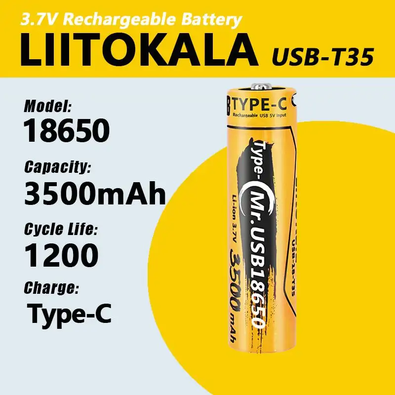 The LiitoKala USB-18-T35 is a 3.7V 18650 Li-ion rechargeable battery with a built-in USB Type-C interface for both input and output functions. Offering a large 3500mAh capacity, it combines portability, safety, and practicality for a wide range of electronic devices.
